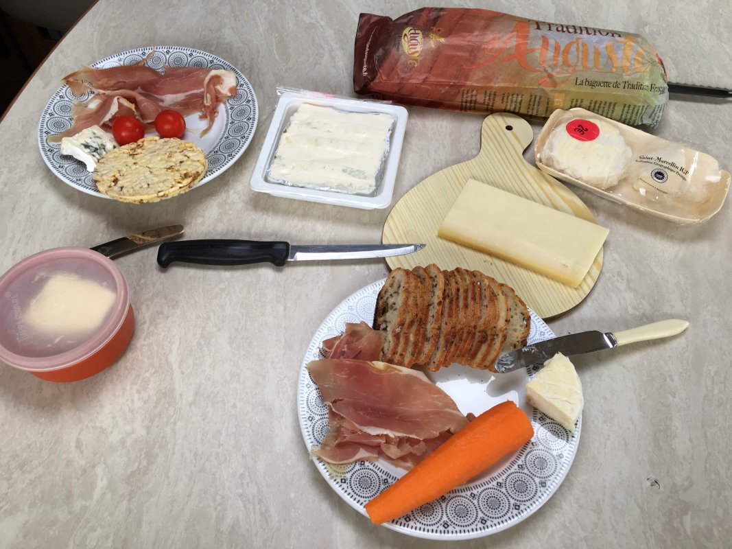 We settled in, then enjoyed a meal sat outside in the sunshine, crevettes (huge prawns in shells) that were on a special offer at InterMarché with Crémant d’Alsace Rosé, followed by stir fried chicken and mushrooms with rice. All very relaxing with the animals and apple trees around us.