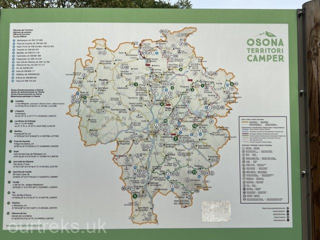 The rain has stopped but the sky is still very heavy. We leave Sant Miquel on GI631 driving south stopping on a lovely lay-by next to the horse stables at Sant Mori with a great view of the Castel. We have a short break for coffee and then get on our way towards Saus taking GI623 towards N-11 and E-15 at Orriols. Turning south on N-11 a good (motorway standard) road, south, a busy section past Gerona, leaving at J.702 Franciac we take C-25 west towards Vic. A steady climb up and up crossing the Massis del Montseny through the mountains to Joanet, an altitude of about 500m at its highest point. There is a mystical view of range after range of mountains as we cross the Massif, each wrapped with a scarf of white misty cloud, all that remains of the early morning torrential downpours. Hymer seems to climb effortlessly up the steady incline crossing Les Guilleries mountains, alternating tunnel and viaducts over seemingly bottomless valleys. We leave C-25 at GI543 taking a tortuous mountain road with hairpins and narrow roads to Viladrau where we find the Aire (Area d’autocaravanes Viladrau). The Aire is level gravel with spaces for about 10 or so mohos (there are about 5 already here) but… the access is very steep (at least as steep and longer than the drive at home) and we do not want to ground Hymer of have to reverse uphill.