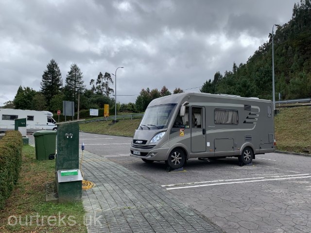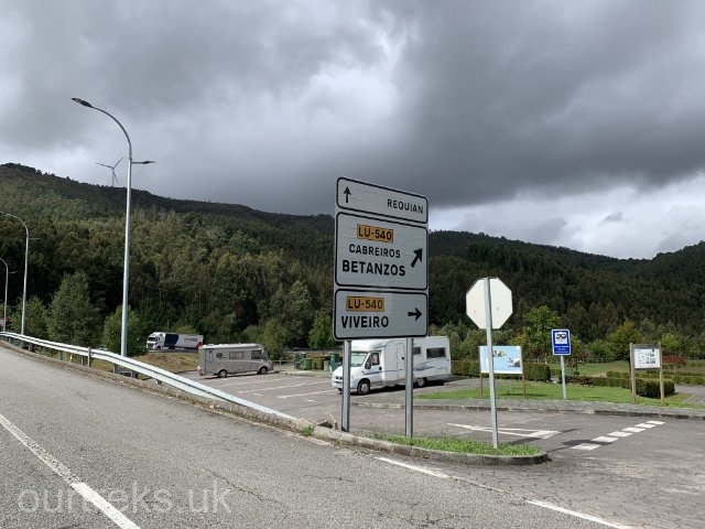 We leave Lagao de Cospeito on the proper road (!), driving through the village of Feira do Monte and onto LU-P-6501 to Vilaester where we take LU-120 to Vilalba, a moderate sized town. Here we take LU-861 to Cabreiros and LU-540 through mountains with excellent views to Ourol. As the road sweeps downhill around a big curve, we see a small green park and a motorhome parked next to it, our next stop for the night.