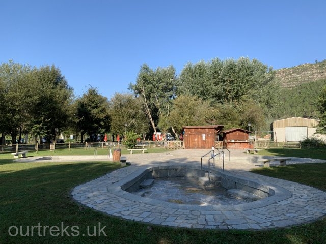The Area de servicio para Autocaravanas is a small circle for 8 – 10 units under trees, behind the café and next to three thermal pools. We park up under the trees, the temperature (in the shade) is 33°C and hotter in the camper. After a short exploration of the thermal pools, I am disappointed to see that two are closed (it says for cleaning) and the third has about eight Spanish people sat around on the low bench in about 9 inches of thermal spa water. I discover later that it should be full (up to their chests when sitting) but, of course there is no water at the moment due to the drought.
