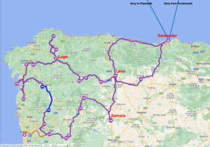 It is after midday when we leave Penedones on N103 through Chã onto M509 through the mountains to Montalegre and on, to the Portugal/Spain border which is in the middle of nowhere. The only reason we know we are in Spain is the Galicia road sign and a change of road name to OU-1109. Another mountain road takes us to the village of Baltar and the OU-304 to Xinzo de Lima. Here Google maps takes a short cut through the tiny (and very narrow) mountain village of Baronzás, it was considerably shorter but what you might call a ‘very exciting’ drive on a bit-too-narrow road. However, we get through without problem and stop at a new Mercadona supermarket.