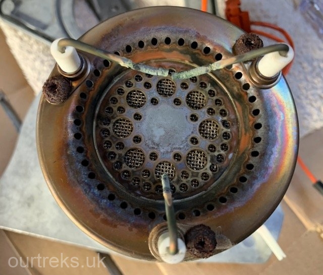 Deep inside the Truma Combi Boiler unit is a gas burner, the flame is ignited by a spark that passes between two electrodes. The electrodes sit in the flame so they are eventually damaged by the heat and have to be replaced. Watch the first 10 seconds of this video and you will see the electrodes are heated by the flame and get red hot. (The video is in German but you don’t need to understand the words to see the electrodes heat up).